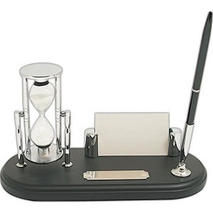 The 3 minute hourglass w/ pen & card holder on black wood base measures 5"H x 9.5"W x 4"D. This item is ideal for any executives desk. It comes with a blank personalization plate that can be engraved. This is a very popular item for corporate events and parties. Hourglasses are aesthetically pleasing ornaments, rather than accurate timepieces. This hourglass is usually accurate to within 2 minutes.